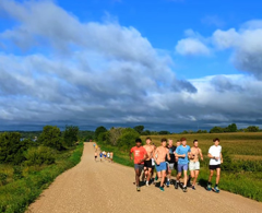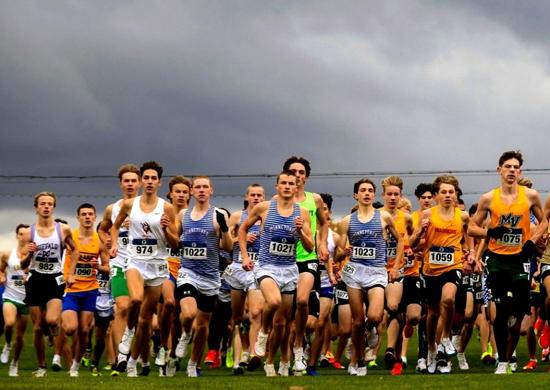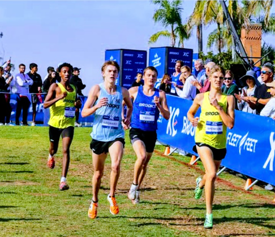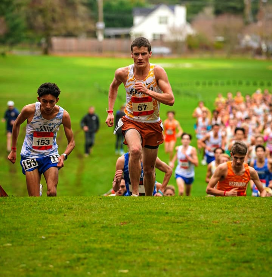 2023 Alumni Run action at the first 400 meters, as the Alumni led by Gilles, Westerlund, Lauerman, and McCollor took charge early, then went 1-2 in the 2.3 mile race, and defeated the Varsity 27-32!